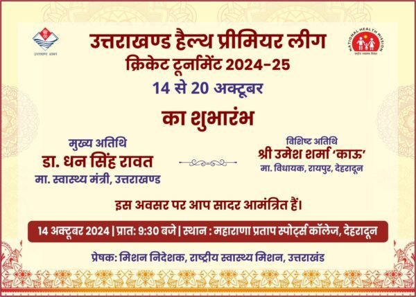 देहरादून। राष्ट्रीय स्वास्थ्य मिशन, स्वास्थ्य विभाग उत्तराखंड द्वारा एक अनूठी पहल के तहत राज्य में पहली बार उत्तराखंड हैल्थ प्रीमियर लीग (यू.एच.पी.एल.) क्रिकेट टूर्नामेंट का आयोजन 14 से 20 अक्टूबर तक महाराणा प्रताप स्पोर्ट्स कॉलेज में किया जा रहा है। इस टूर्नामेंट का उद्देश्य खेल के माध्यम से विभिन्न स्वास्थ्य विषयों पर जागरूकता फैलाना है। उत्तराखंड हैल्थ प्रीमियर लीग क्रिकेट टूर्नामेंट में प्रदेश के 8 विभाग भाग ले रहे हैं, और प्रत्येक विभाग एक विशेष स्वास्थ्य थीम के अंतर्गत खेलेंगे। इन थीमों के जरिए स्वास्थ्य के महत्वपूर्ण मुद्दों को समाज के समक्ष रखा जाएगा।